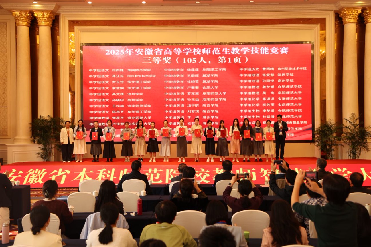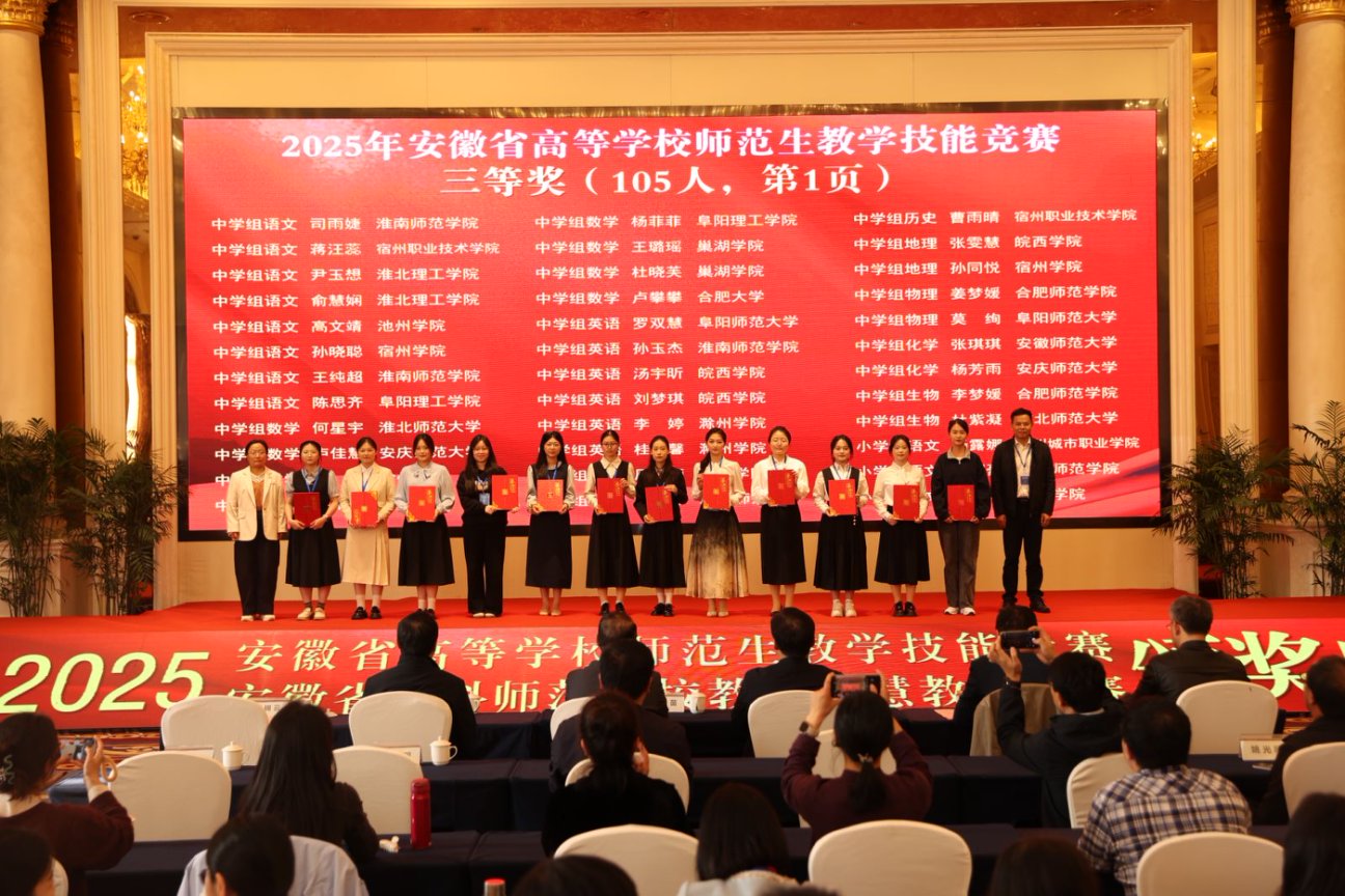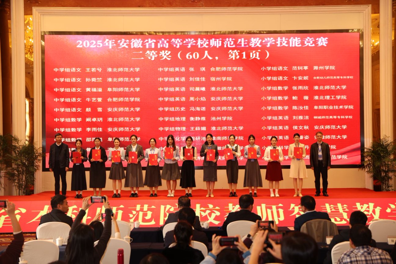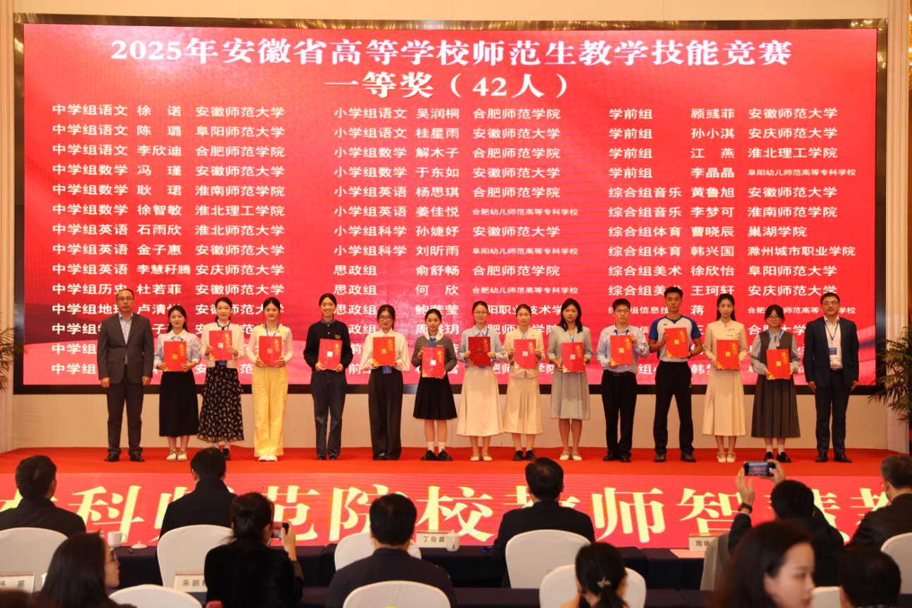 11月2日下午,由安徽省教育厅主办、合肥师范公司承办、安徽省高等院校教师教育合作委员会协办的“2025年安徽省高等公司师范生教学技能大赛”,在合肥师范公司滨湖校区圆满落幕。自7月14日启动筹备至赛事收官,公司历经111天的层层遴选与精心打磨,推荐13个员工(团队)代表公司出征省赛,最终12个参赛主体成功获奖。其中,一等奖2项、二等奖3项、三等奖6项、优胜奖1项。