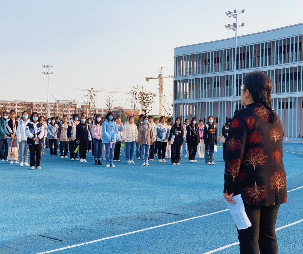 升旗方阵整装待发,动作整齐划一,踏步刚劲有力。伴随着《义勇军进行曲》,升旗队员迈着铿锵有力、整齐划一的步伐向着升旗台进发,以最庄严的姿态面对国旗,全体师生注视着五星红旗冉冉升起。