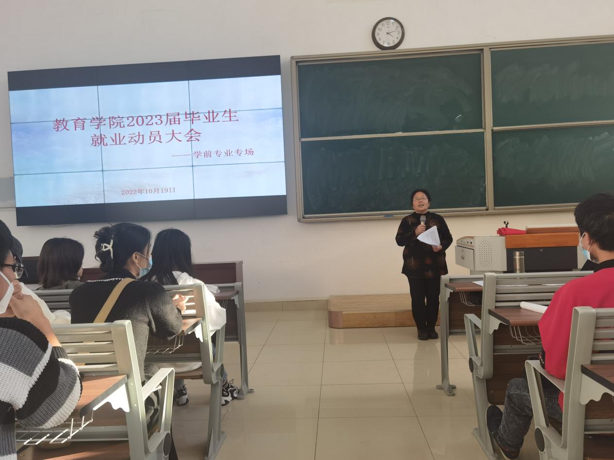 2022年10月19日下午,公司在教学楼121教室召开2023届毕业生就业动员大会。为帮助2023届毕业生准确有效地确定就业方向,尽快地让同学们在思想、行动上早做准备,指导毕业生如何走好从大学走向社会的重要一步。william威廉王家云经理、孟向红副书记及学前教研组老师出席本次会议,2023届william威廉学前教育专业全体毕业生参加会议。会议分两场进行,分别由william威廉学前教育专业辅导员任若晨、侯莉萍主持。