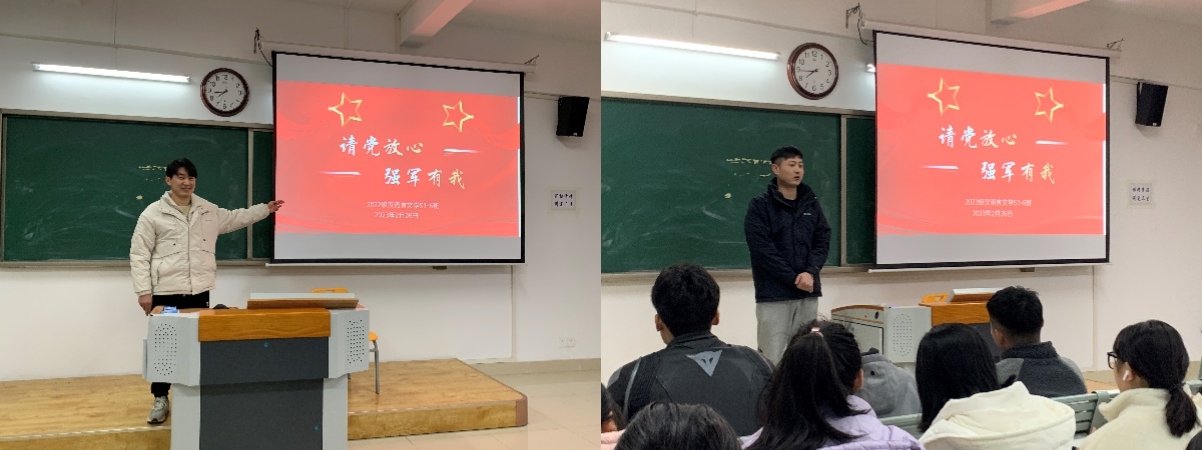 会上,李应华老师用PPT演示和入伍宣传手册来进行演示和宣传。其次让本专业退伍的四名同学向大家分享自己的入伍初心、军旅生活和退伍收获,动员符合条件的同学们积极响应国家号召,积极准备,毕业前踊跃报名参军。通过退伍同学的经验分享,同学们对当兵入伍有了更加清晰的认识,并且意识到今天的美好生活,离不开党和国家的艰苦奋斗,激发同学们的爱国之情。