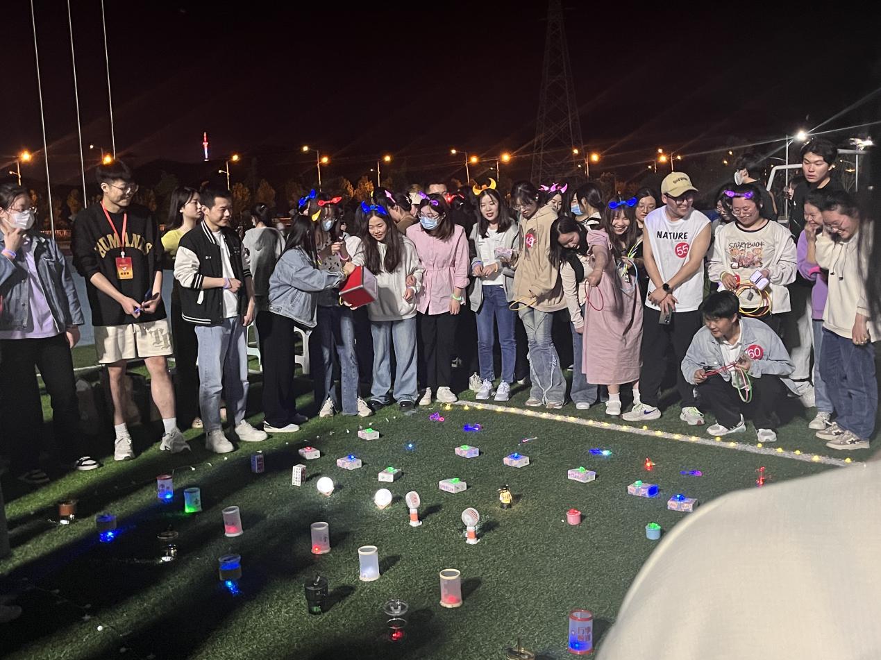 参加活动的同学、老师云集在操场主席台前,在工作人员的引导下,有序排队、签到,并领取号码牌、荧光棒等荧光物资,工作人员讲解了活动规则及注意事项,孙虎老师做了简短的动员讲话。大家在领队带领下做了热身运动后,按照规则打开运动软件Keep按照指定路线等待夜跑开始。光影跳动,荧火相随。参加活动的同学迫不及待地拿起荧光棒,戴好荧光手环,等待着比赛的开始。随着一声号令,队员们一起化身为光,点亮公司的操场。