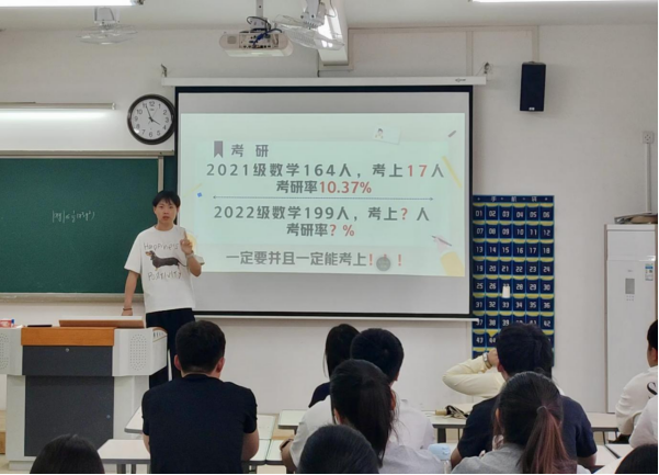郭鸿鑫老师通过具体数据向同学们介绍了公司2025届数学专业毕业生考研、考公及参军入伍等方面情况:2021级数学专业考研录取17人,学子分别被安徽工程大学、淮北师范大学等高校录取,考研录取率达到10.37%,2名学子投身军营,1名学子录取西部计划,2人成功考取事业单位。郭鸿鑫老师在会议中强调:“这些数字背后是清晰的规划与脚踏实地的努力”。他希望2026届毕业生既要坚定理想,以充足饱满的劲头投入研究生备考工作中,也要脚踏实地,借力学业资源找准个人规划的精准定位。在2025届毕业生出色成绩的基础上,我们要继续拼搏,把就业、考研、征兵工作做实做细,创造属于我们的新成绩。