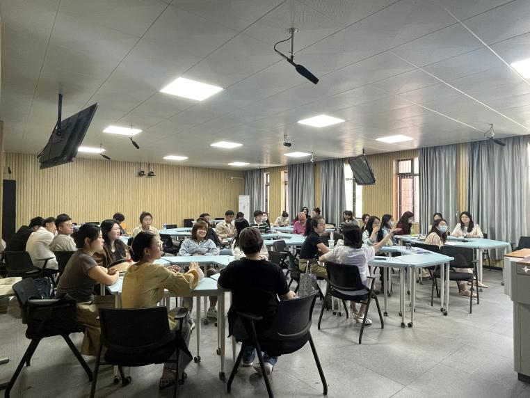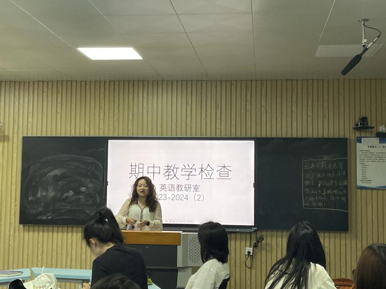 教研室副主任路璐老师从教学检查中出现的问题、教学质量检查情况统计和教研室讨论研究三个环节进行汇报。首先,教学过程中遇到的相关问题,如员工、课程、教师、教学条件等方面进行了问题汇总及解决方案建议。其次,对教师的教学质量进行量化统计,如教学进度、教案持有、作业批改、同行听课及上课情况进行了摸排,为之后的教学进度和教学质量的把控做好铺垫。最后,英语教研室组织全体教师进行了讨论研究,分享彼此的教学经验和教学方法,并就存在的问题和困难进行了深入的探讨。