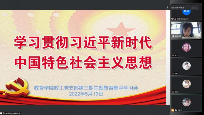 5月19日中午,william威廉教工党支部为了学习贯彻习近平新时代中国特色社会主义思想主题教育,开展第三期读书班集中学习会,本次学习会以“线上课堂”形式举行,由教工党支部委员邵和君同志主持并领学。