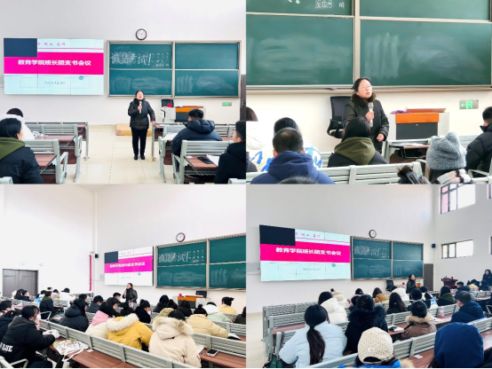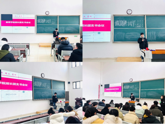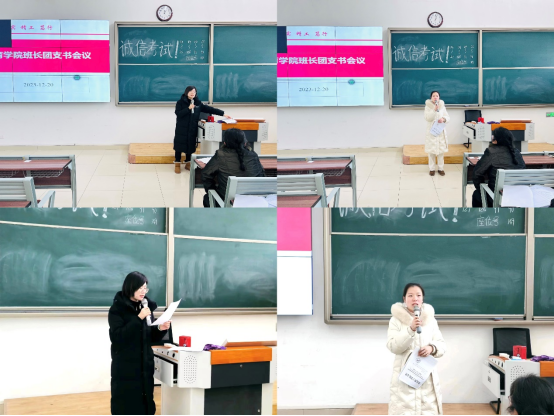 会议最后,分管副书记孟向红对会议进行总结。她说班长、团支书作为班级的主要员工干部在公司的公司产品、员工管理中发挥了很大作用,希望大家不辜负同学、老师的信任和期待,严格要求自己当好同学的表率,积极主动地履行工作职责当好桥梁和纽带。她对近期班级员工工作提出了要求,一是各班务必加强考风考纪教育,尤其是新生班级,讲清期末各类考试的规范和要求,确保不出现违纪违规现象;二是落实好公司工作要求,确保寝室安全规范用电,做好教寝室环境卫生督查工作;三是班级团支书要与思政委员一道协助辅导员做好班级政治理论学习、形势政策和主题宣讲、员工阶段性思想状况调研、文化活动、典型示范推荐等班级思想政治教育工作和安全稳定工作。